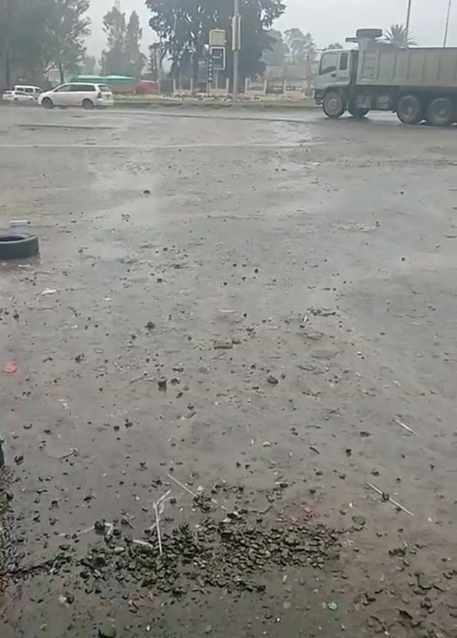 wet, gray, and muddy scene in what appears to be a roadside area or parking lot. The ground is primarily dirt and small gravel, with scattered debris like bits of plastic and discarded items. In the background, one can see a road with vehicles passing by, including a large dump truck and a truck with the word "Gilgil" visible on its side. The weather seems overcast or rainy, contributing to the muted colors of the scene. There is no distinct activity or people in the immediate foreground of the video.