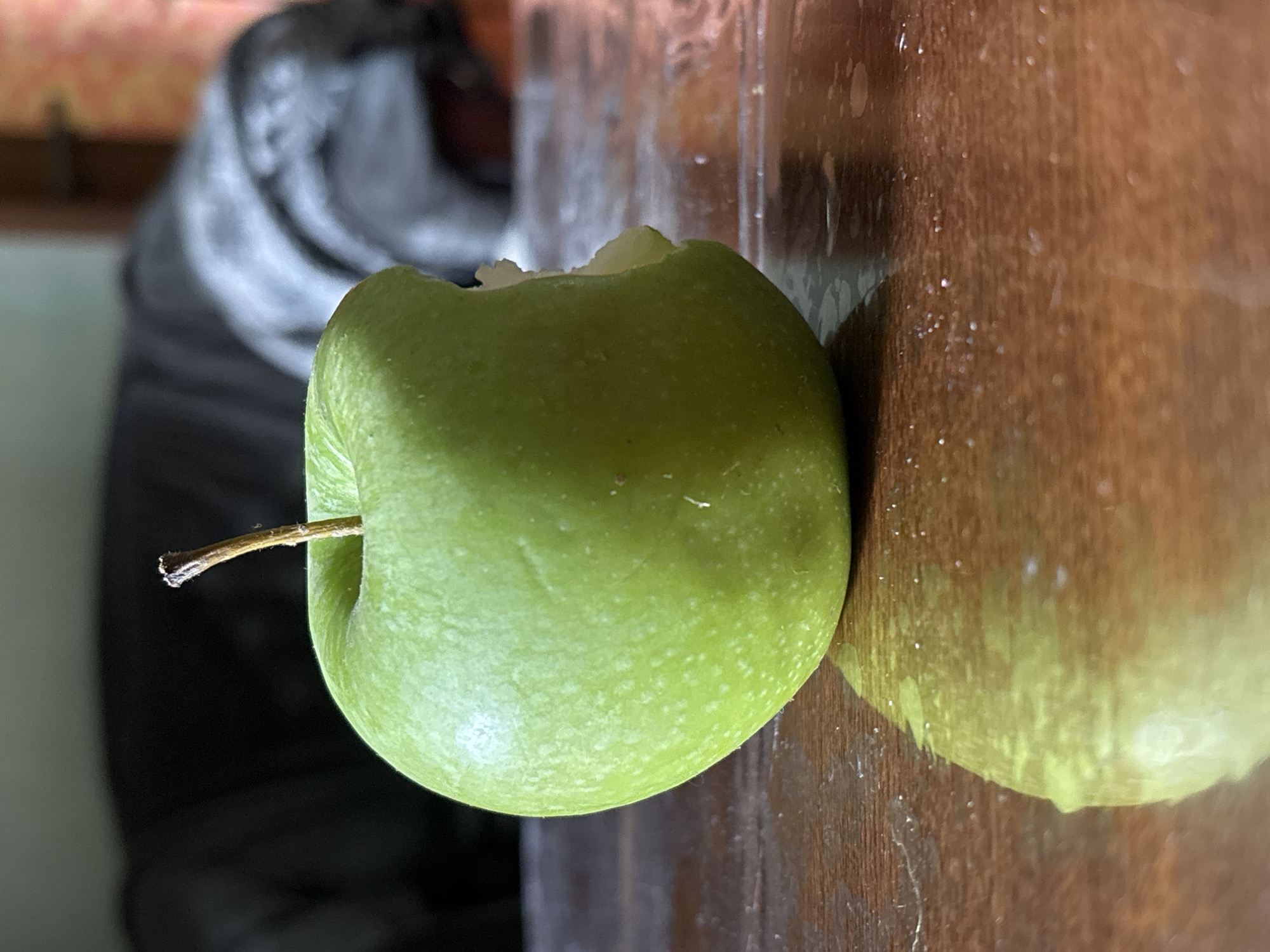 A green apple with a bite taken out of it sits on a varnished wooden surface. A reflection of the apple can be seen in the surface of the wood. In the blurred background, a gray, draped object is visible. The location is Unknown, Unknown.