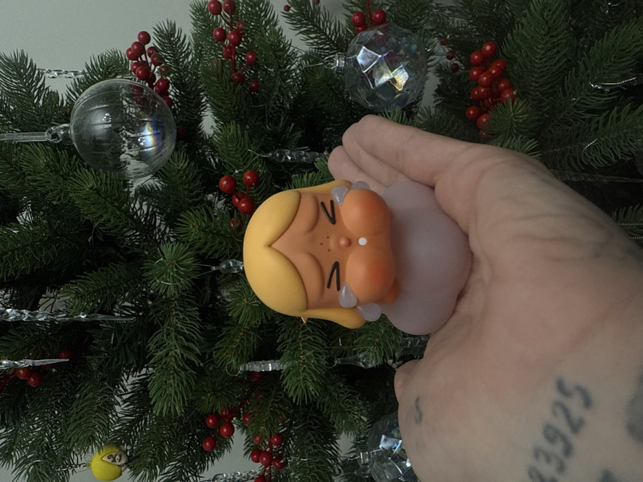 In an indoor setting in Rostov-on-Don, Russia, a close-up photograph depicts a human left hand holding a stylized figurine against a decorated artificial Christmas tree. The hand displays dark ink tattoos on its palm, including the numerical sequence "33925" and an "S" near the base of the thumb. The figurine, held upright in the palm, features a yellow bowl-cut hairstyle, an orange face with closed eyes indicated by inverted "V" shapes, prominent puffy cheeks, and transparent teardrop elements on either side of its face. Its base is a translucent, light pink, amorphous form. The background Christmas tree, with green artificial needles, is adorned with red berry clusters, clear icicle-shaped ornaments, a silver ribbed spherical ornament, a faceted iridescent spherical ornament, and a small yellow spherical ornament with a facial drawing.