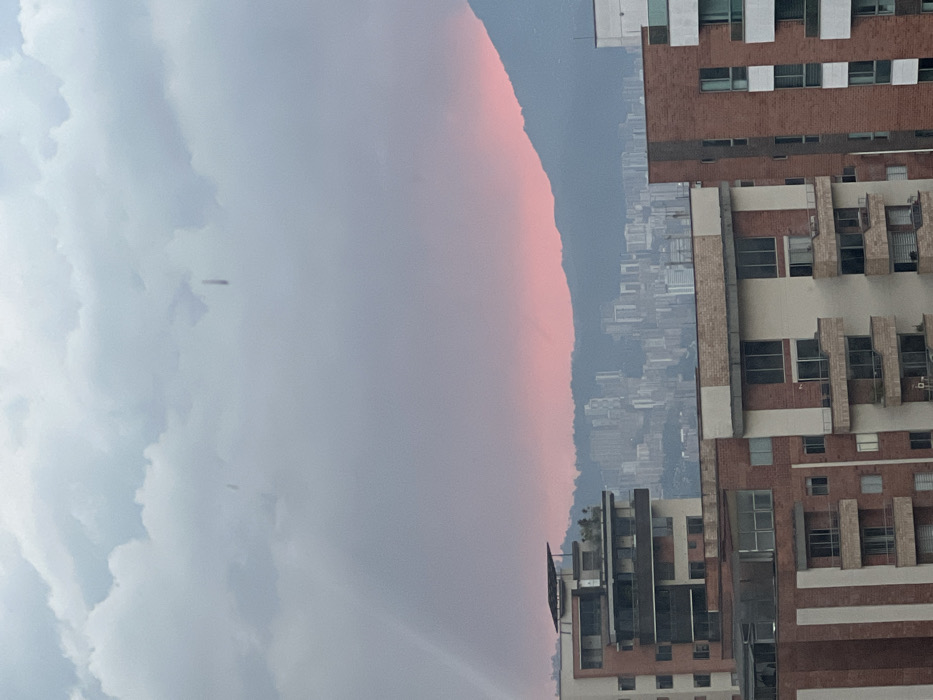 A cityscape shot at dusk reveals buildings juxtaposed against a mountain range. On the left, cloudy skies dominate, with hints of pink illuminating the mountain's edge. Taller buildings with brick and light stone accents are prominent on the right side. The city below the mountain is shrouded in a slight haze, appearing dense with buildings.