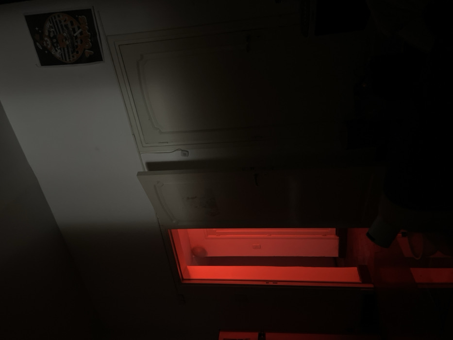 A dim, tilted view shows a room's interior, dominated by two white doors, one above the other. The upper door is mostly obscured in darkness. The lower door reveals a bright, reddish-orange light shining from the interior. A black, square decoration hangs on the upper wall, near a slanted ceiling. The rest of the room is shrouded in deep shadow.