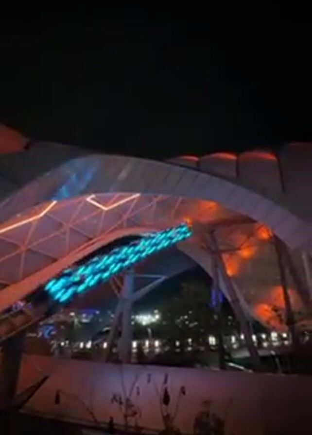 At night, a roller coaster train with blue lights travels along a curved track inside a white, futuristic structure illuminated with orange lights