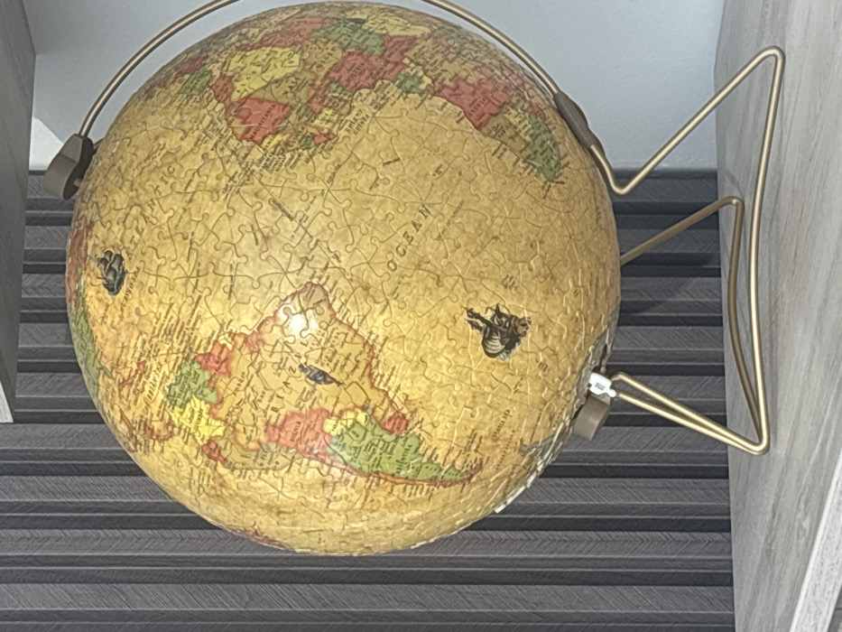 A globe constructed from jigsaw puzzle pieces is centered in the frame