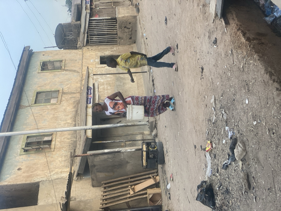 A woman carrying a bucket walks past a boy in a yellow shirt on a dirt road. Behind the woman, a building with peeling paint has windows with broken panes. A satellite dish is visible on the roof. Debris litters the ground, including a generator and some wooden pallets. The scene appears to be in a poor, urban area.