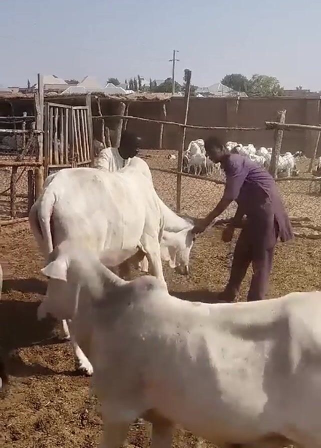three men interacting with two white cows in a pen. The pen has a dirt floor with straw and manure. In the background, a fence encloses a flock of sheep. One man in a purple shirt and another in a white shirt are holding onto the head and horns of one of the cows. The third man stands nearby, observing. The cows are moving around, seemingly resisting. The environment appears to be a rural or agricultural setting, with buildings and foliage visible in the distance. The sky is clear and bright, indicating daytime.