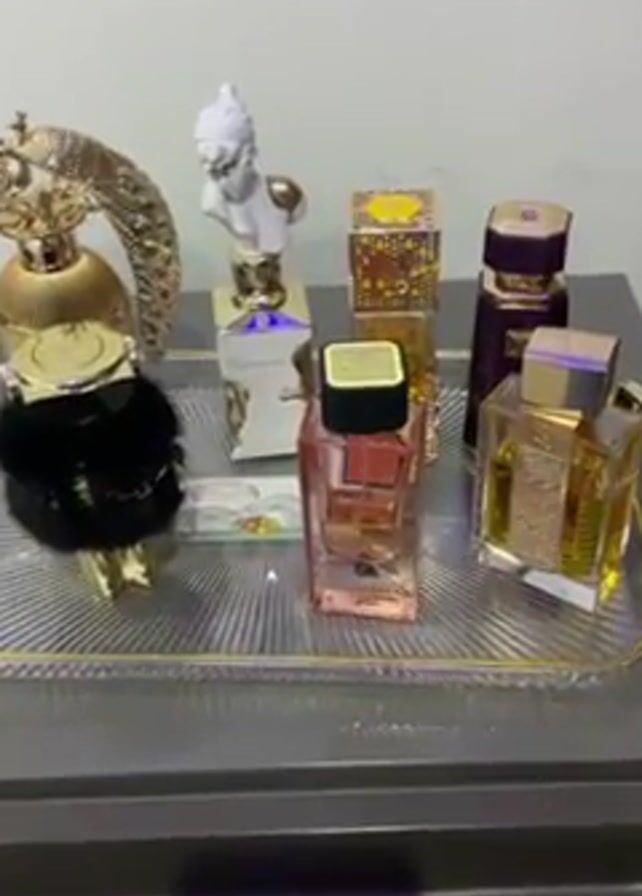 A close-up video shows a collection of perfume bottles displayed on a shiny, decorative tray
