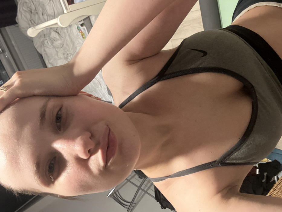 The scene depicts a young adult female indoors, located in a private residence within the city of Khimki, Russia. The subject is shown from the chest up, taking a selfie. She has fair skin, with her hair pulled back, and her lips are slightly pursed as she looks directly at the camera. She is wearing a grey sports bra with black trim, featuring a black Nike swoosh logo on the front, and dark shorts with a white stripe along the bottom edge. Her left hand is raised, with fingers resting on her forehead; a ring is visible on her left ring finger. The background on the right side of the image features a bed with white, rumpled bedding and a light-colored headboard. On the left, a metallic multi-tiered rack or shelf unit is partially visible, along with a wicker basket containing dark fabric. A light-colored floor is visible beneath the subject, covered in part by a green mat.