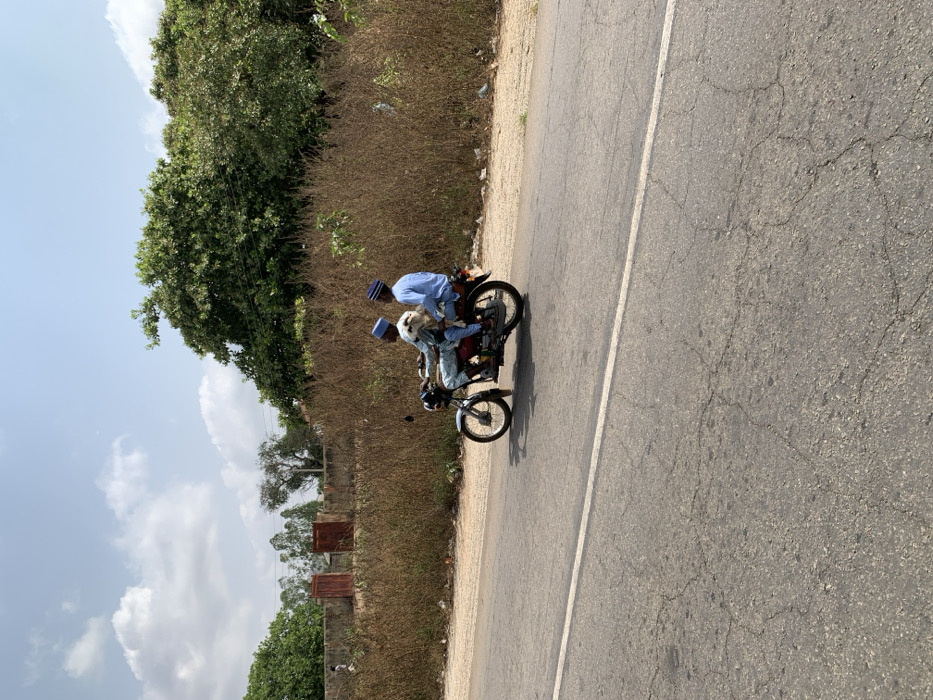 - "An outdoor scene in Gbeleko, Nigeria, depicts two individuals and a dog riding a motorcycle on an asphalt road under a partly cloudy sky" by FM-JIEGo1, licensed under CC BY 4.0