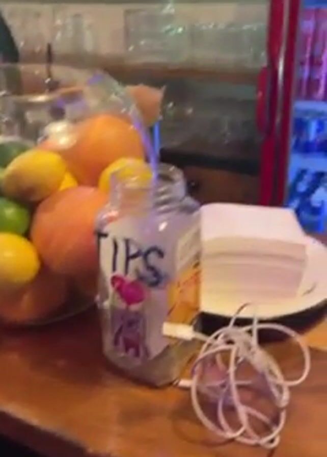 The camera pans from a glass bowl filled with oranges, lemons, and limes and a tip jar on a bar countertop to a close-up of a row of three point-of-sale (POS) systems and a QR code for a menu