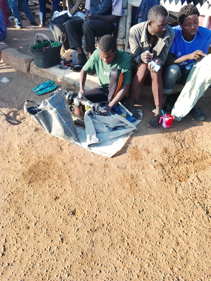 A group of people are gathered on a dirt ground near a bench. One person is seated on the ground operating a sewing machine with fabric beneath it. Two people are seated on the bench, one holding a small tube. There is a bucket nearby with items inside. A pair of flip-flops is also on the ground. The area appears to be an outdoor workspace.