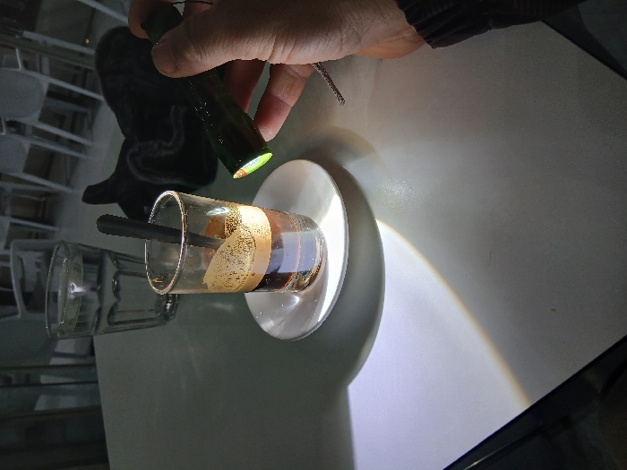 A hand holds a flashlight over a glass of brown liquid with a black spoon inside, resting on a white saucer
