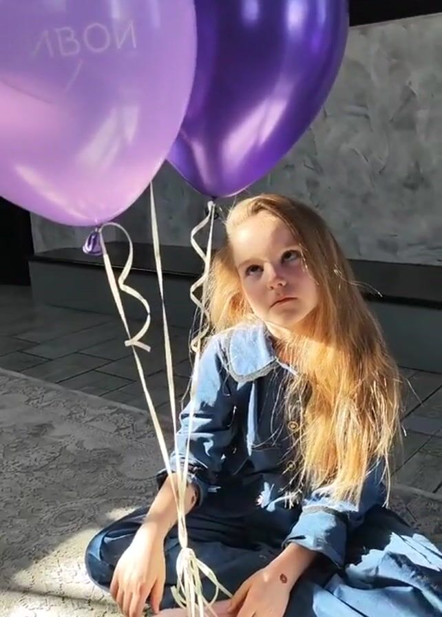 A young girl with long blonde hair is sitting on a textured floor. She is wearing a blue denim-like dress with a distinct collar. Her legs are crossed, and she is holding the strings of two balloons, one lavender with writing in Russian on it, and the other a darker purple. The girl appears to be looking downwards with a slightly melancholic expression. On her left wrist, there is a small red mark or abrasion. The background is a gray wall with a recessed section, possibly a modern architectural detail. The lighting suggests natural sunlight coming from the side, illuminating the girl and balloons.