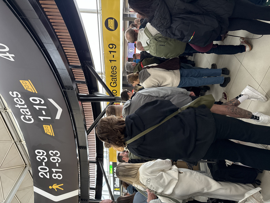 This image depicts a crowded interior scene within London Stansted Airport, Uttlesford, United Kingdom, specifically in a concourse area leading to departure gates. An overhead curved black sign with white text provides directional information: "Gates 20-39 81-93" is indicated to the left by a walking person icon, while "Gates 1-19" is indicated to the right by a train icon and a downward arrow. Below this, a yellow sign reinforces "to Gates 1-19" with a train icon. A dense group of approximately 20-30 individuals, predominantly viewed from behind, are either queuing or standing in a general waiting area. Notable individuals include: - In the left foreground, a person with blonde hair wears a white sweatshirt displaying "ESPORTS" and white trousers, with a black rolling suitcase at their feet. - Central to the foreground, a person with dark, wavy hair wears a black hooded top, black trousers, and a green cross-body bag. This individual's lower right leg displays extensive tattoos and they wear white socks and white athletic shoes. - To their right, a person wears a light-colored knitted sweater, blue jeans, and dark shoes, carrying a dark woven bag. - Further to the right, a person with grey hair wears a dark jacket and a green Thule backpack. - On the far right, a person in a black puffer jacket with a small rainbow stripe on the shoulder is visible. The floor is composed of light-colored tiles. The ceiling is white and paneled. Structural elements include black metal beams supporting the signage, featuring a decorative series of reddish-brown vertical slats. The scene indicates a typical busy airport environment with passengers awaiting transit. No direct interactions between individuals are discernible.