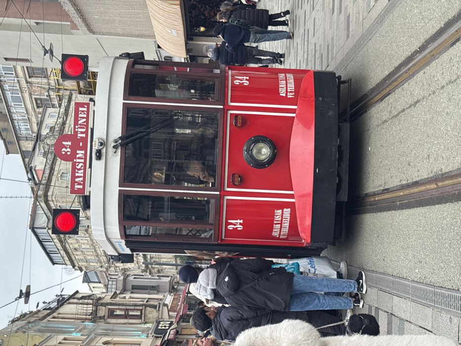 The scene captures a red and white historical tram, numbered "34" and displaying "TAKSİM - TÜNEL" as its destination, stationary on tracks within a street in Beyoğlu, Istanbul, Turkey