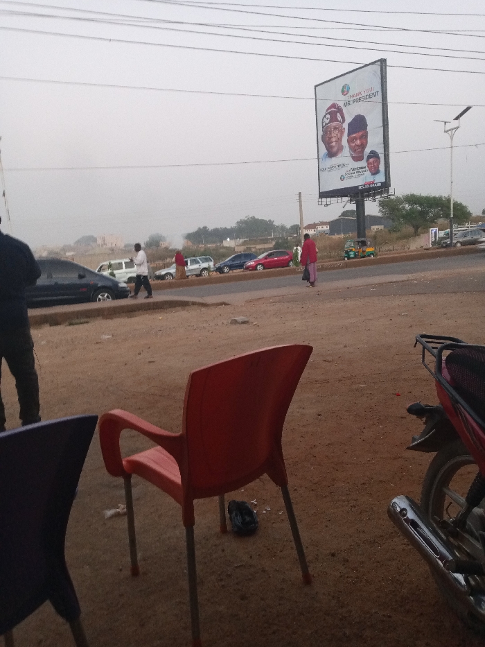A street scene features a large billboard displaying a political advertisement with portraits of three figures labeled "MR. PRESIDENT." Cars are parked along the roadside, and pedestrians walk nearby. In the foreground, an orange plastic chair sits on dirt, with a glimpse of a dark blue chair to the left and the rear of a motorcycle on the right. A black plastic bag rests on the ground near the orange chair. Overhead, power lines stretch across the sky.
