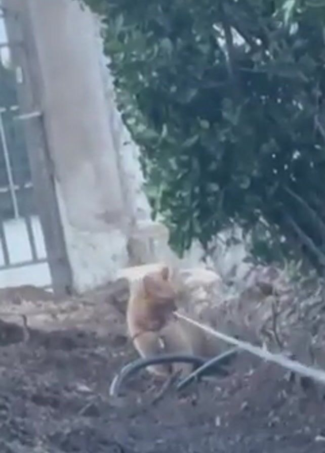 A light-orange domestic cat is sitting in a dirt patch on a leash. A fence and a tree are in the background. The cat turns to face forward with its mouth open, then turns its head and sits. An offscreen person speaks.