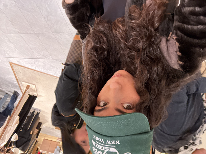 A woman with long, curly brown hair wears a green baseball cap and looks at the camera. She is wearing a dark coat with a fur collar. A Louis Vuitton handbag is visible on her shoulder. She is standing in a store with a display rack of clothing in the background. The floor is tiled, and a mirror is visible to the left. The image is rotated so the woman is upside down.
