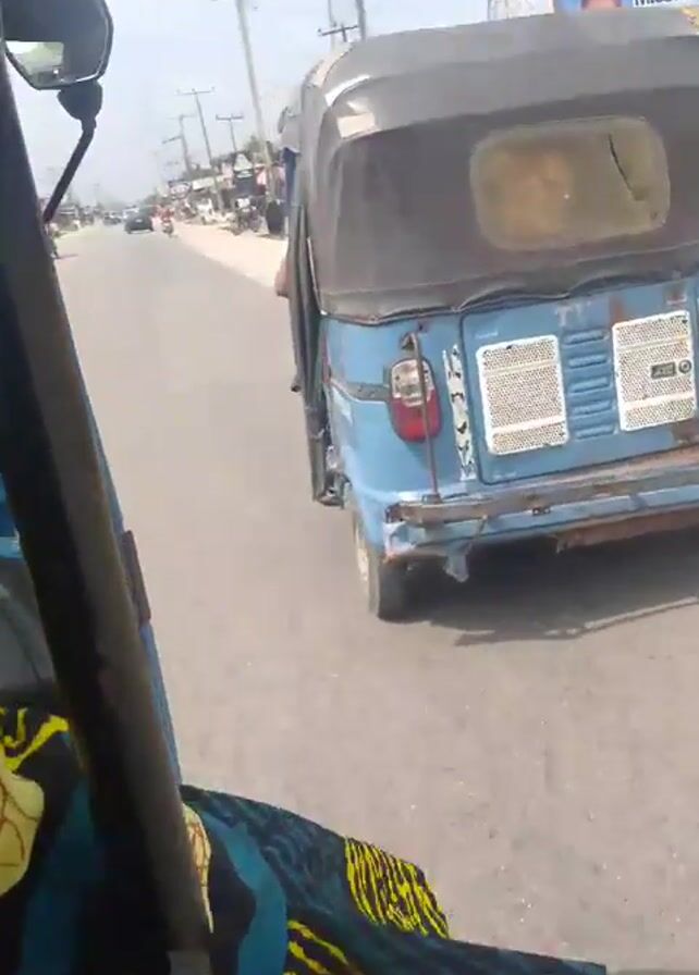 A person is riding in a blue auto rickshaw on a paved road. Other auto rickshaws and motorcycles can be seen on the road. Power lines and utility poles run along the roadside. Buildings and structures are visible in the background. The person in the rickshaw is wearing a brightly patterned yellow, blue, and black shirt. The view is from inside the rickshaw, looking forward and slightly to the side.