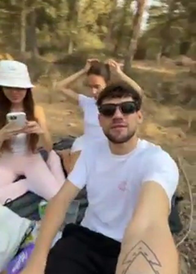 The video begins with a selfie-style shot of a young man wearing sunglasses and a white t-shirt. He is sitting on the ground with two young women. One woman is wearing a white bucket hat and light pink clothing, holding a phone. The other woman is wearing a white top and pulling her hair up. They are sitting on a blanket surrounded by trees. The camera then pans around to show the forest setting with tall pine trees and a dirt ground covered in pine needles.