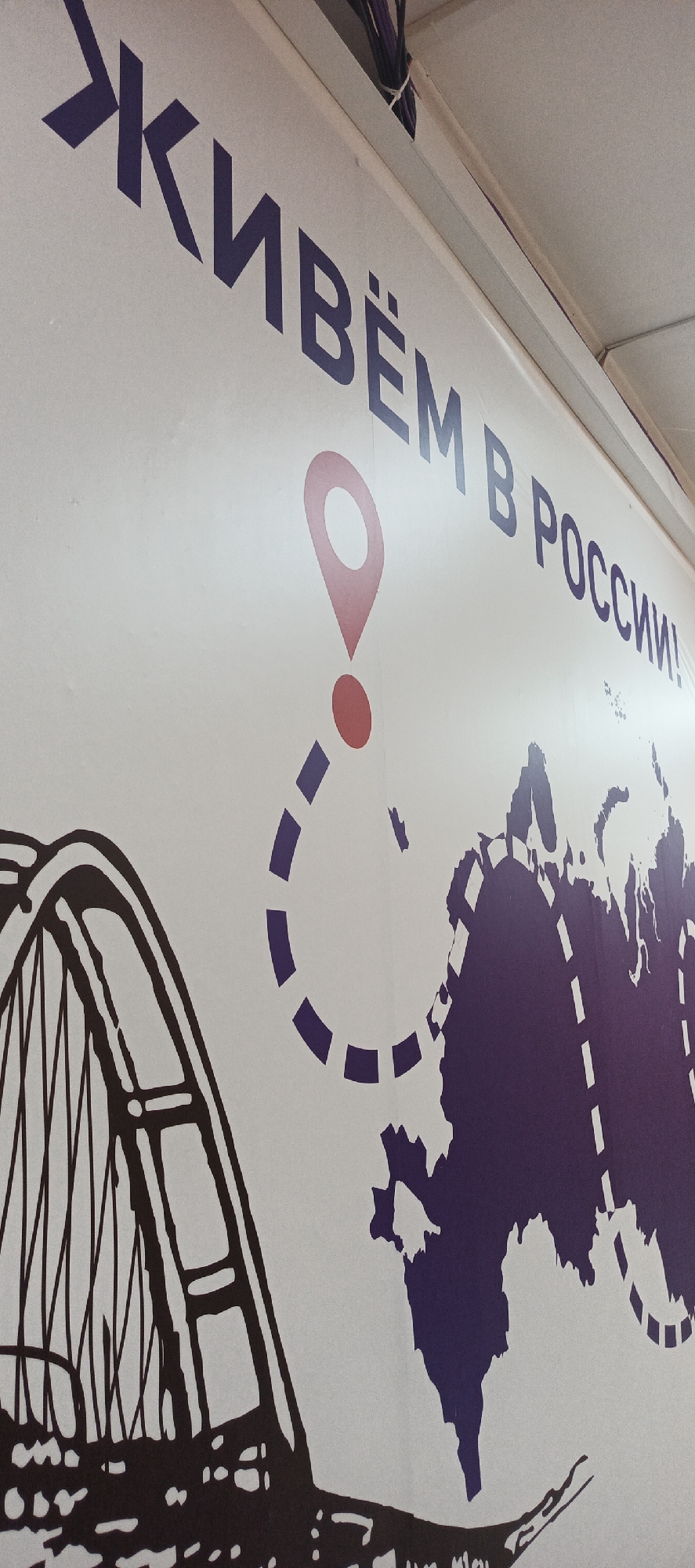 wall graphic with the phrase "Живём в России!" (We live in Russia!) in large, purple Cyrillic letters. Below the text is a red location pin above a dashed purple line that traces a route over a dark purple map outline. To the left of the map, there's a black and white drawing of a bridge. The graphic is applied to a white wall, with the top portion of the wall meeting a white ceiling, where some electrical wiring is visible. The overall impression is that of a promotional or informational display within a public space. It is unknown if this image is located in the city of Nar'yan-Mar, Russia, or even in Russia itself.