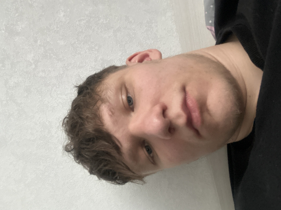 The image displays an upward-angled close-up portrait of a single individual, identified as a young adult male. He has short, textured brown hair with a fringe, blue eyes looking slightly downwards, and fair skin exhibiting minor redness on the cheeks. Light stubble is present on his chin and jawline. He is wearing a black crew-neck top. The background consists of a plain, light grey or off-white wall with a subtle textured finish. No discernible environmental features are present to determine a specific location within the city of Perm, Russia, or any other geographical area.