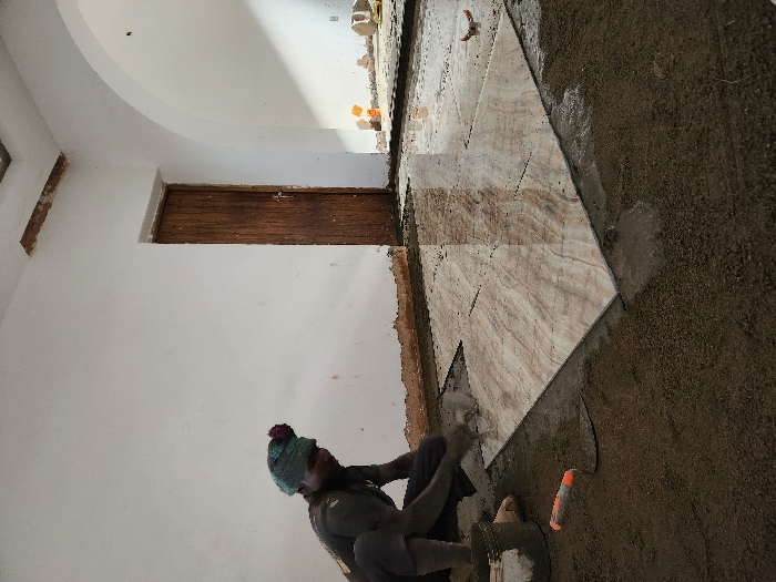 An indoor space shows a person installing tiles on the floor. The tiles are large and triangular, with a beige marble-like pattern. The floor is partially covered with what appears to be cement or mortar. The man, wearing a hat, is using tools to set the tiles in place. A doorway is visible along the wall, and the upper wall is white.