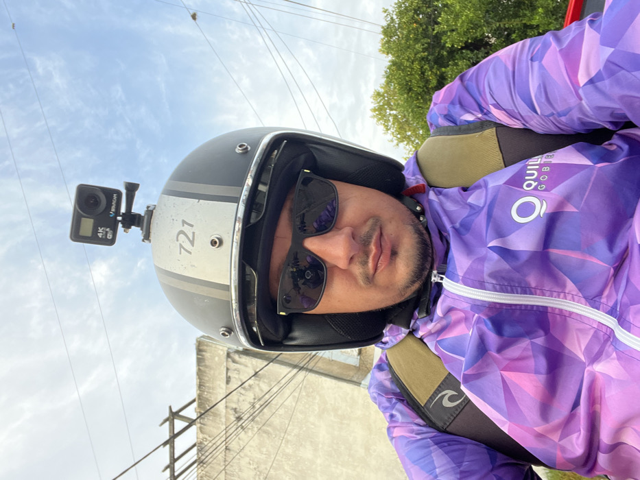 A male individual is depicted in a medium-close, self-taken portrait, likely situated in Bernal Este, Argentina. He has a light mustache and stubble and is wearing black rectangular sunglasses. He wears a black open-face motorcycle helmet, which features two grey stripes and the number "721" on its crown. A black BSRCAM 4K action camera is centrally mounted on top of the helmet. The individual is dressed in a purple, pink, and blue geometrically patterned jacket with a white zipper, displaying a "QUILMES GOBIERNO" logo on the right chest area. A tan backpack strap is visible over his right shoulder. The background consists of an overcast sky, multiple dark utility wires crossing horizontally, a light-colored concrete building with a partial roof structure on the left, and green foliage on the right.