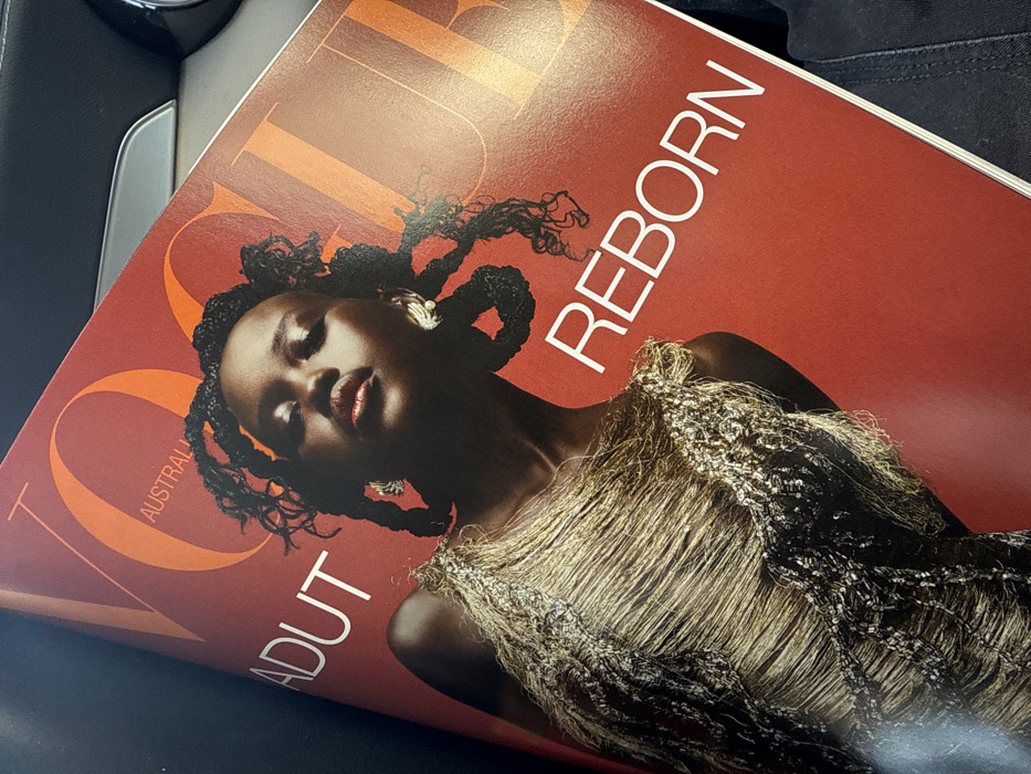 In the city of Los Angeles, United States of America, a "Vogue Australia" magazine is positioned diagonally within the interior of a vehicle