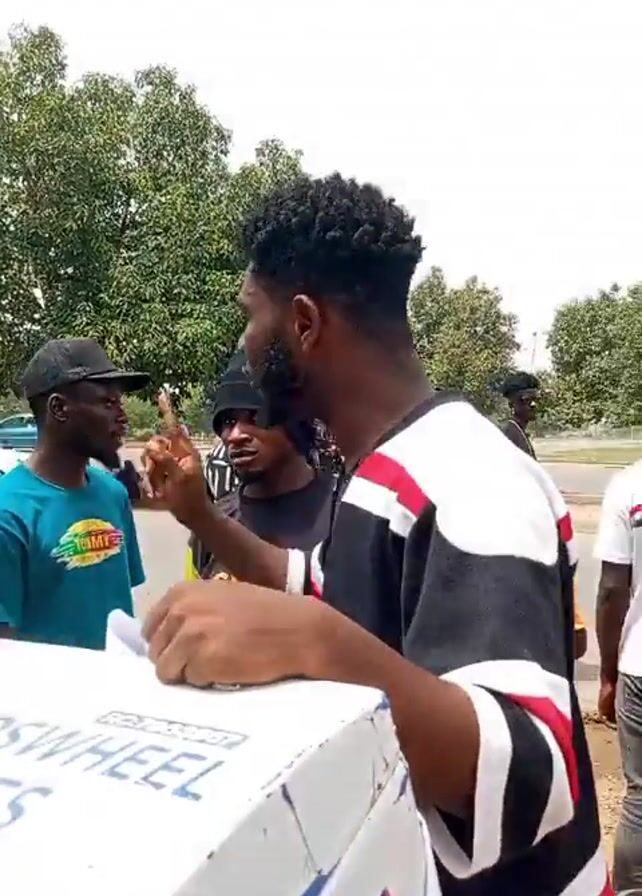 group of people standing outdoors, possibly discussing something related to the sign they are standing next to. The sign is for "CJAY AUTOSWHEEL ENTERPRISES" and lists "OUR SERVICES." The man closest to the camera is wearing a black and white shirt with red accents and is speaking, gesturing with his hands. The others are listening to him, their expressions vary from neutral to somewhat concerned. One of the men is wearing a "Glovo" shirt. The setting appears to be a sunny day on a street or parking lot with trees in the background. In the background, there is a parked car, people, and motorcycles can be seen.