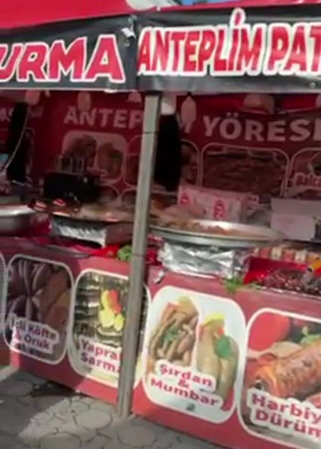 food stall under a red and white tent with the Turkish words "Anteplim Patlican" and "Ciğer Kavurma" written on it