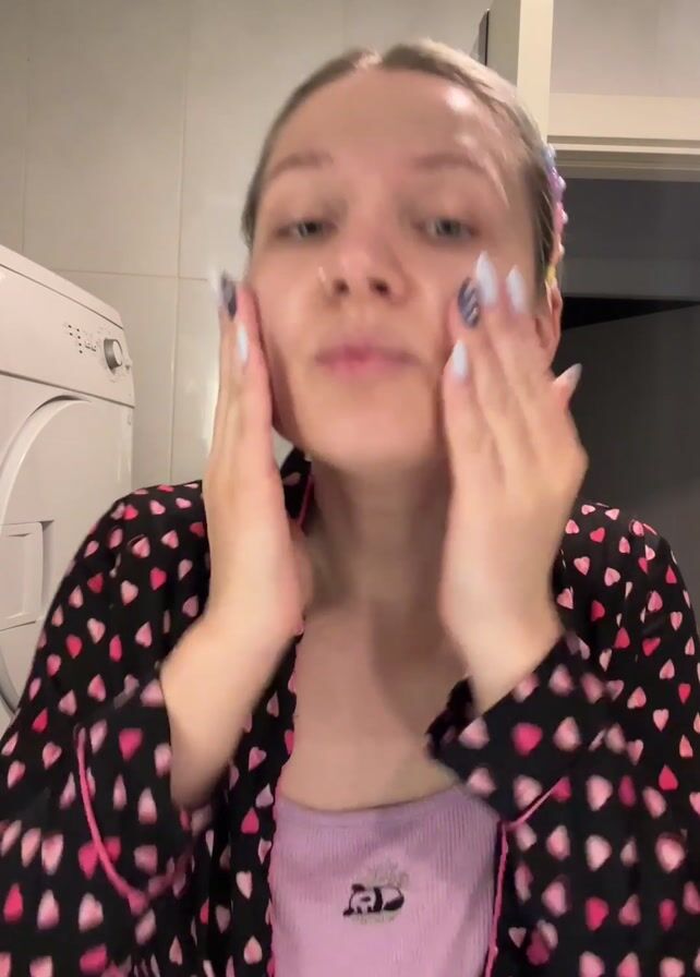 woman in a bathroom applying a facial cleanser to her face. She has her hair pulled back with a headband, and she is wearing a pink tank top under a black pajama top with pink and white hearts. She is standing in front of a white washing machine and a door. The bathroom has tiled walls. The woman rubs the cleanser all over her face in circular motions.