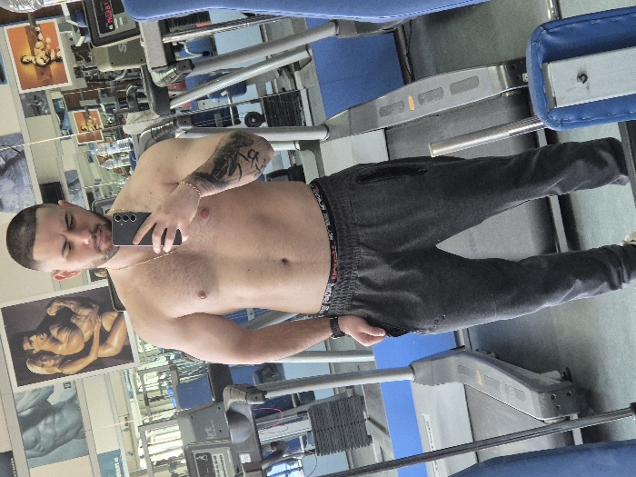 A male subject stands bare-chested in a gym, taking a mirror selfie with a black smartphone held in his right hand