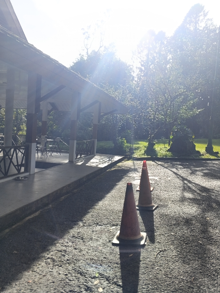 Two orange traffic cones stand on an asphalt surface, casting long shadows. To the left, a covered structure with tables and chairs is visible. Beyond the cones, green trees and vegetation create a park-like background. The scene is bathed in bright sunlight.
