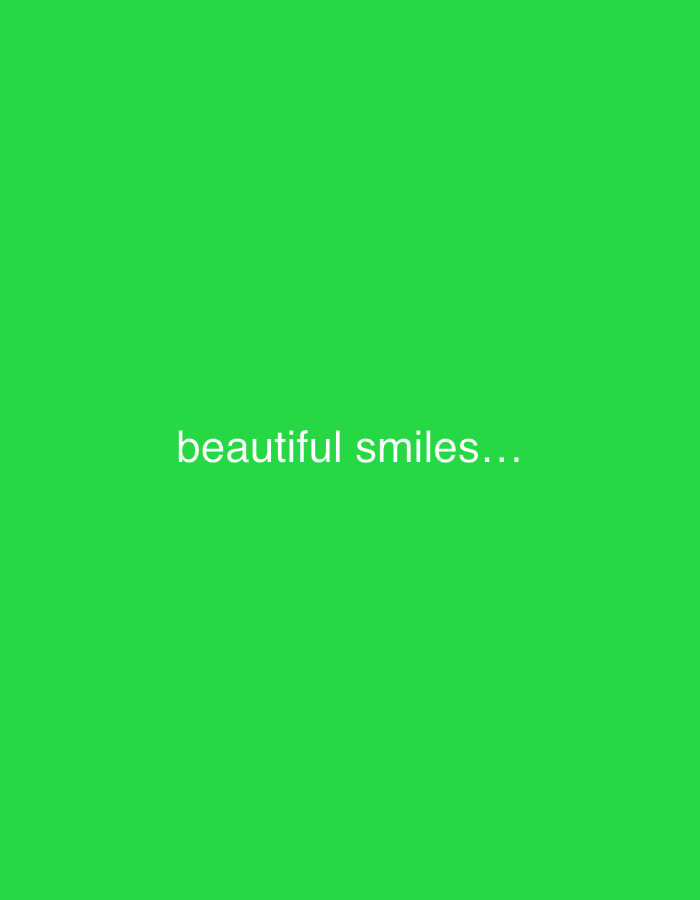 The image displays a solid, uniform green background (hexadecimal color approximation #32CD32 or similar). Centered vertically and horizontally within this green field, white sans-serif text reads "beautiful smiles...". There are no other discernible subjects, objects, people, actions, interactions, or environmental features depicted. The image contains no visual information that indicates a specific location within the city of Louisville, United States, or any other physical location.