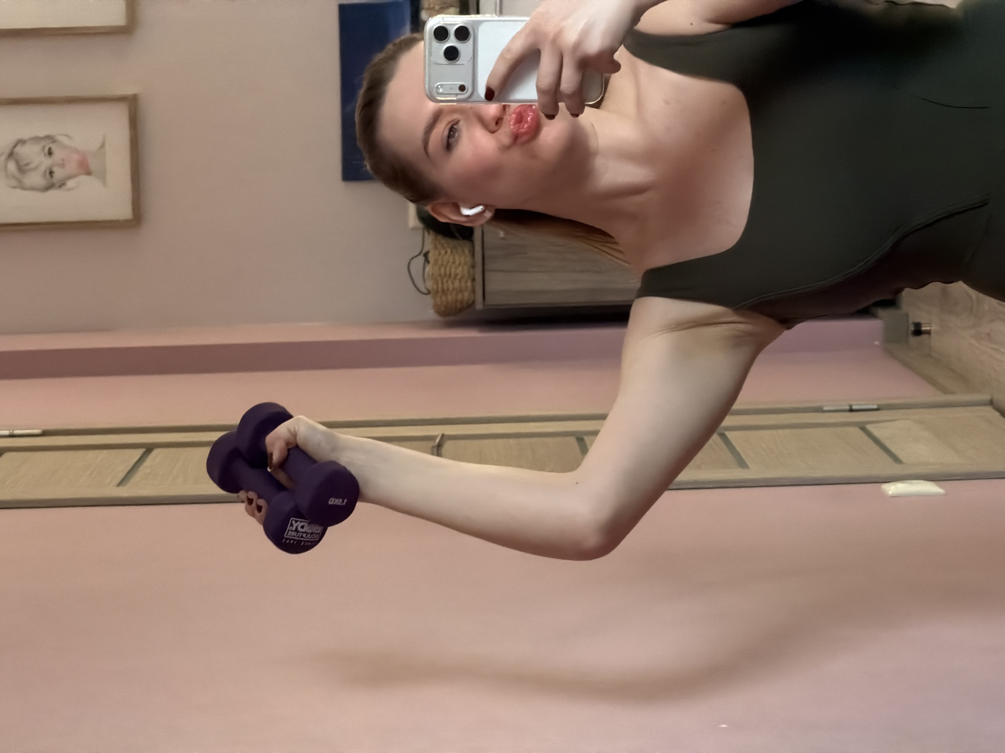 woman in a dark green athletic top taking a selfie in what appears to be an interior space. She is holding two small, purple dumbbells in her outstretched arm. The background includes a pinkish wall, a wooden door or paneling, and framed artwork on the wall. Behind her, there's a woven basket and what appears to be a blue object. The location in Dreiliņi, Latvia cannot be confirmed by the image alone.