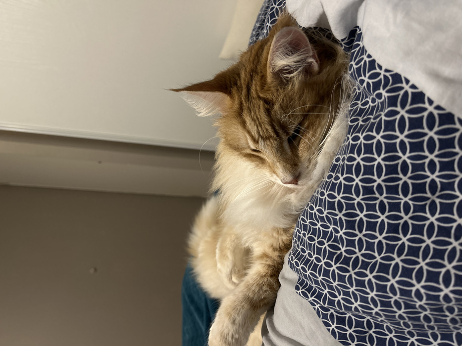 - "The scene depicts a long-haired cat, primarily ginger-orange with white markings on its chest and paws, sleeping soundly on a bed" by FM-dAK2v2, licensed under CC BY 4.0