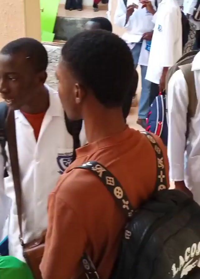 group of young men in what appears to be a school or college setting. Many of them are wearing white lab coats with what seems to be a school emblem on the chest. They are gathered in a well-lit hallway with beige pillars and walls. Some individuals have backpacks slung over their shoulders. The group seems to be in conversation, either amongst themselves or waiting for something to happen. Some people are visible in the background, both indoors and outdoors. The overall atmosphere appears to be casual and students appear to be preparing for class or leaving after class.