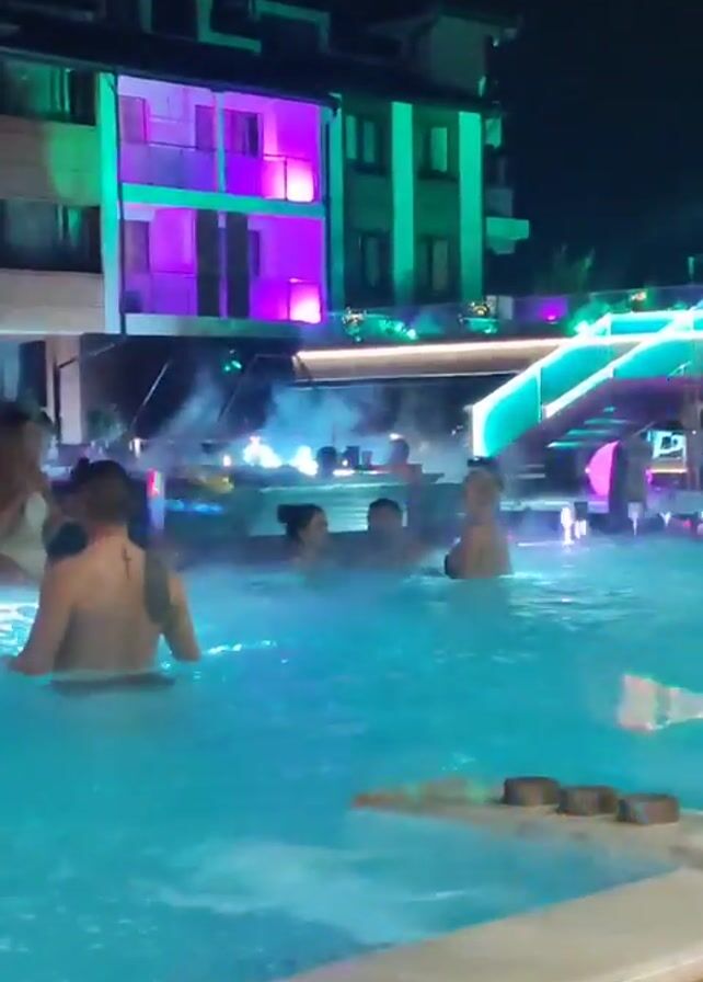 A video shows a crowded outdoor pool at night. The water is turquoise and several people are wading in it, some up to their shoulders. Steam rises from the surface of the water. A building with purple and green lights is visible in the background. Some people are standing near a bar in the distance. Electronic dance music is playing.