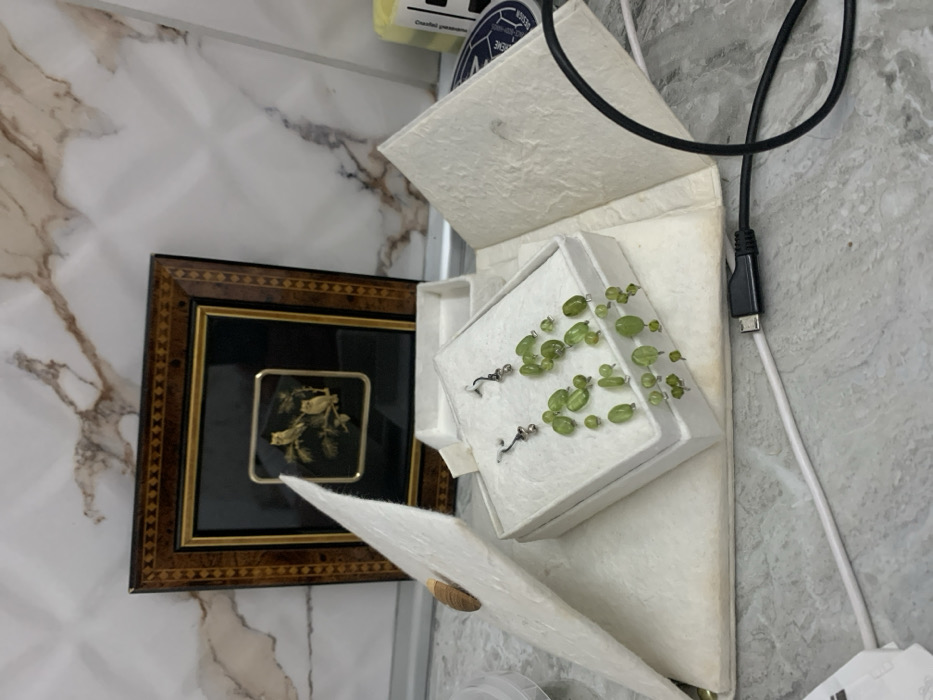 A pair of earrings, each comprising multiple strands of oval-shaped green beads suspended from silver-colored hooks, are presented within an open small white box. This box rests inside a larger, open textured white paper presentation case, the left flap of which is upright and secured by a light-colored wooden button and elastic loop. Behind these items, a square framed artwork depicts two golden-colored owls perched on a branch against a dark background, set within a dark brown frame with a decorative patterned inlay. A black cable with a USB-C connector and a thinner white cable extend across the lower right foreground. The items are situated on a light-colored, subtly veined countertop, positioned against a wall clad with white, textured panels featuring brown marble-like patterns. The scene is located in Balgarsko Slivovo, Bulgaria.
