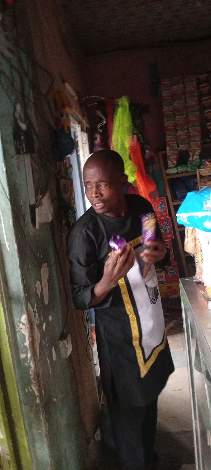 A man stands in a dimly lit shop, holding two chocolate bars in his hands. He wears a black robe-like shirt with white and gold trim. The shop appears to be stocked with various goods, including snacks and other items on shelves and behind a glass counter. Exposed wires and a weathered doorway are visible to the left, adding to the shop's rustic atmosphere.