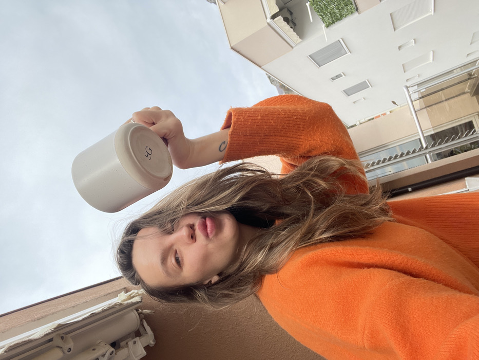 A young adult female, positioned in front of a light brown wall, is captured from the chest up. She wears an orange knitted sweater and has long brown hair. Her lips are pursed in a pout, directed towards the viewer. Her right hand is raised, holding a cylindrical, light-colored ceramic mug or candle holder upside down, revealing an embossed "SG" logo on its base. A small "C" tattoo is visible on her right inner wrist. The background features a cloudy sky above an urban environment. To the left, a light-colored awning or building fixture is partially visible. To the right, a multi-story white building with several rectangular windows, some equipped with white roller shutters, stands opposite. A beige awning extends from an upper balcony of this building, and a lower balcony features a railing with artificial green foliage. A distant mountain is visible on the horizon to the far right. The scene is located in Budva, Montenegro.