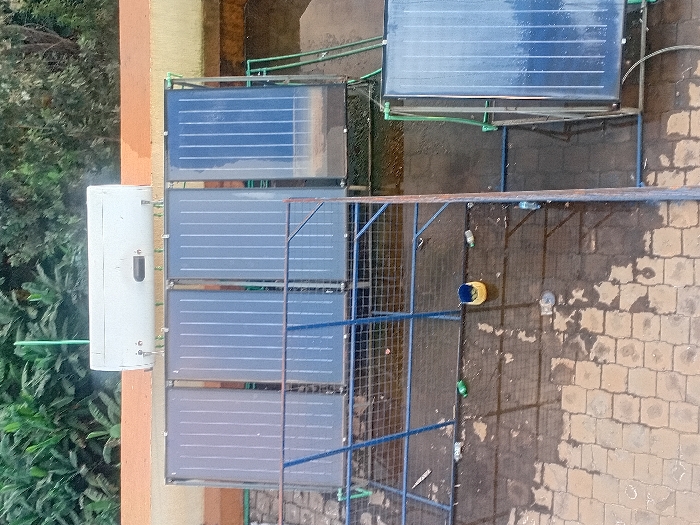 This image captures an outdoor rooftop or elevated paved area located in Karingani ward, Kenya, viewed from an overhead perspective. The scene is characterized by solar water heating equipment. At the top, a white, horizontal cylindrical hot water storage tank is mounted on a brown-orange parapet wall. Directly below this tank, four vertically oriented solar thermal collector panels are installed in a row on a blue metal support structure. A fifth, similar solar thermal collector panel is visible in the lower right section of the frame, also connected by green piping. The ground area is paved with interlocking concrete blocks, displaying irregular wet patches. A blue metal grid-like structure extends across a portion of the paved surface. Scattered on the paved ground are various items of debris, including a yellow bucket with a blue handle and several plastic bottles, some green and some clear. Dense green foliage is visible above and behind the parapet wall in the background. No individuals are present in the image.