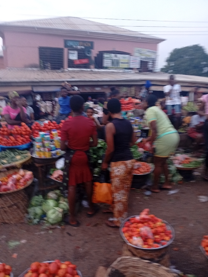 A bustling outdoor market teems with activity. Customers browse stalls overflowing with produce, particularly tomatoes in baskets and containers. Individuals in casual attire stand around vendors. A two-story building with signage stands in the background. The scene seems to be taken during the daytime.