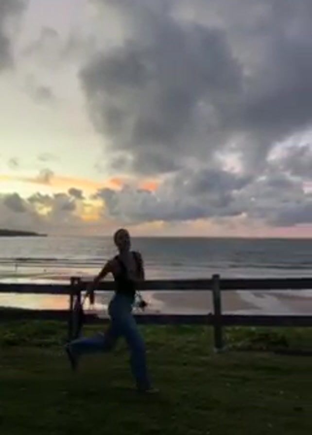 woman on a grassy hill near a beach at sunset. She is wearing a black tank top and blue jeans. She performs a jumping split in the air, then laughs and points towards the beach. There is a low wooden fence between the grassy area and the beach. The beach stretches out to the ocean, and the sky is filled with dramatic clouds.