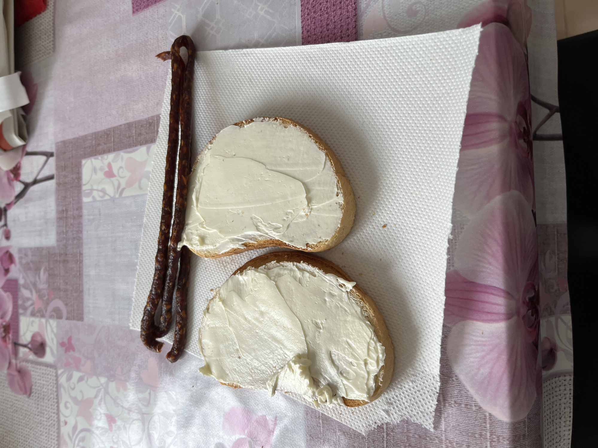 meal laid out on a patterned tablecloth, possibly indoors. Two slices of bread are spread with a white creamy substance, likely cream cheese or butter. Three long, thin, dark brown sticks, resembling dry sausage or jerky, lie beside the bread slices. The food rests on a white paper napkin. The context of the location being in the city of Sopot, Bulgaria, is not directly visible in the image and would require additional information or context to confirm.