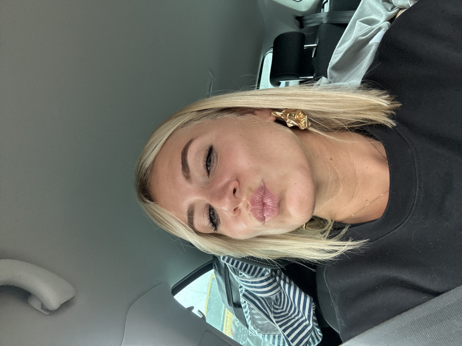 The image displays a close-up selfie of a single individual, likely female, with blonde, shoulder-length hair, seated in the interior of a vehicle