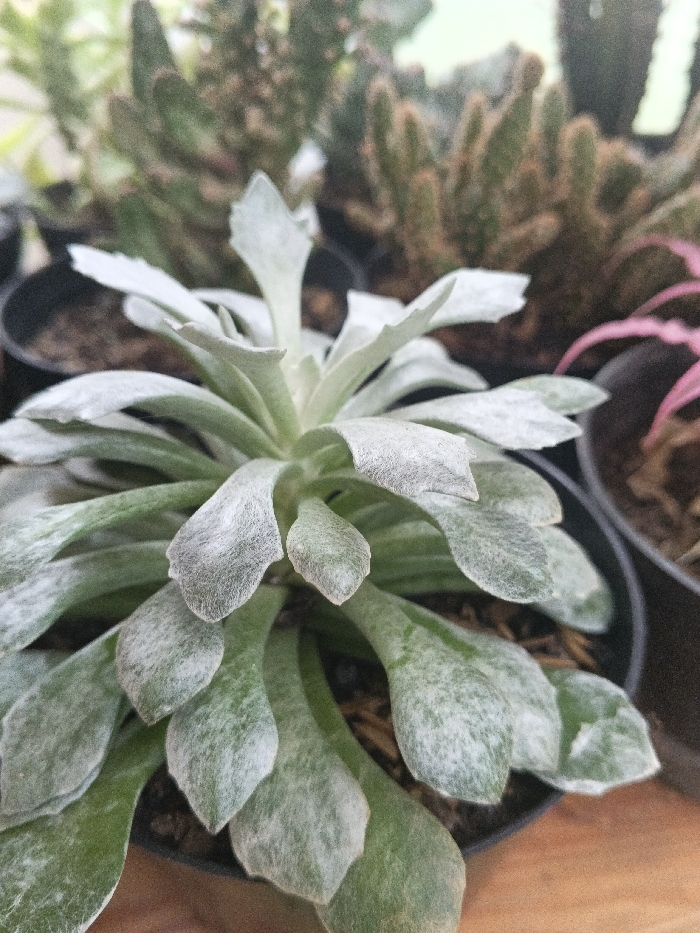 A close-up, high-angle shot depicts a succulent plant, approximately 20-25 cm in diameter, centered in a black plastic pot, located in Munyati, Zimbabwe. The plant exhibits numerous green, spatulate leaves, densely covered in a fine, white, powdery or fuzzy indumentum, giving them a grayish-white appearance. The leaves radiate outwards from a central stem, with the outer leaves appearing broader and slightly variegated with green and white mottling. Dark soil and brown organic material are visible within the pot. In the blurred background, several other potted plants are present: a green, multi-stemmed succulent or cactus to the upper left, a brown-red, segmented, fuzzy cactus to the upper right, and a plant with thin pink stems further right. A light brown surface, possibly wood, is partially visible beneath the foreground pot.