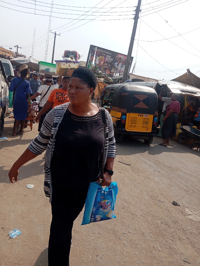A woman walks through a busy outdoor market. She is wearing a black dress, a striped cardigan, and a black headband. She carries a blue plastic bag. The market scene includes people, stalls, a yellow three-wheeled vehicle, and overhead wires. A large advertising billboard is partially visible in the background. The ground is a dusty brown.