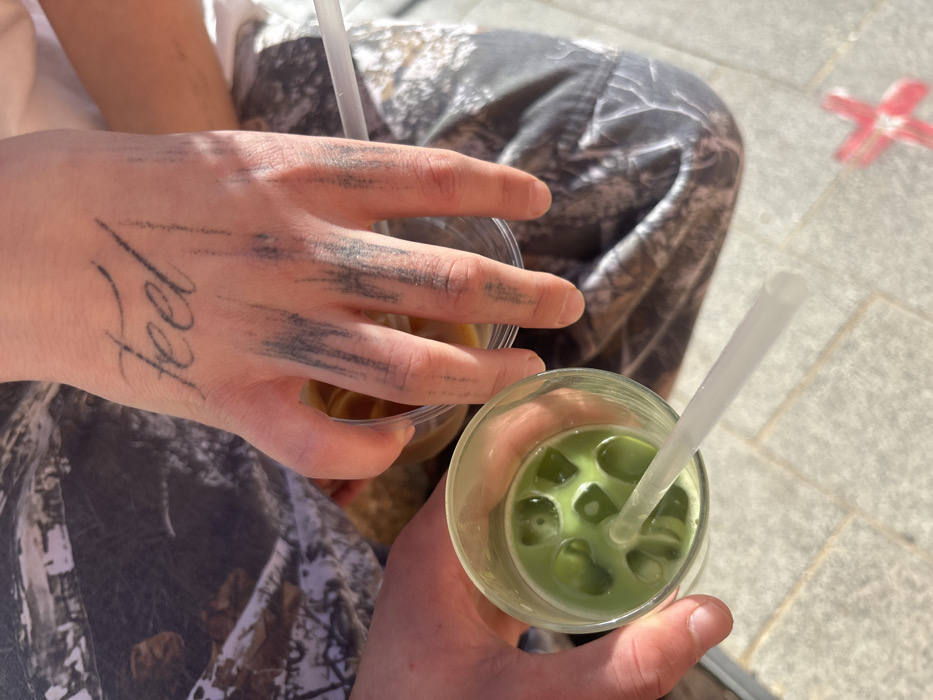 A high-angle, close-up photograph captures two hands holding beverages over the lap of an individual, situated outdoors on a paved surface in Tel-Aviv, Israel. The right hand, centered in the frame, displays a faded tattoo of the word "Feel" in cursive script across its knuckles. Multiple dark, vertical smudges, consistent with charcoal or similar residue, streak down the fingers from the knuckles. This hand grasps a clear plastic cup containing a light brown liquid and a clear plastic straw. To the left, a second hand holds a clear glass filled with a vibrant green liquid containing multiple ice cubes and a white plastic straw, indicative of a matcha drink. The individual is wearing camouflage-patterned pants in shades of green, brown, and black. The ground beneath consists of light-colored, rectangular paving stones, suggesting a patio or pedestrian zone. A blurry red "X" mark is visible on the pavement in the lower right quadrant. The scene is illuminated by bright, natural daylight.