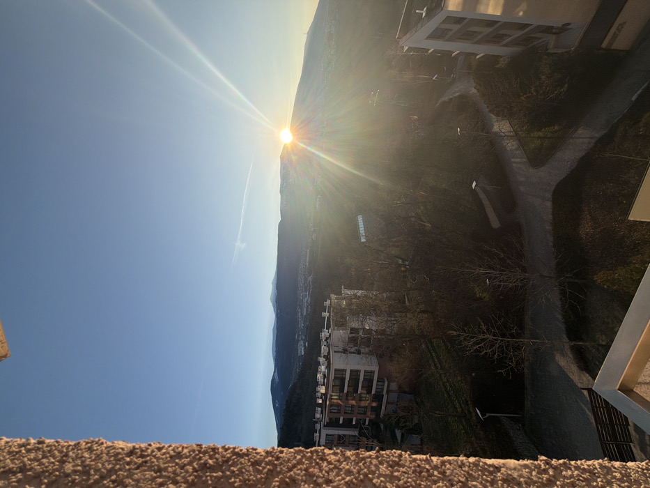 The image presents an elevated, outdoor wide shot captured during sunrise or sunset, evidenced by the low sun position and prominent sunbeams. The vantage point is from a balcony or high floor of a building, indicated by a textured, light brown/beige wall on the left and a light-colored railing at the bottom. In the immediate foreground, a winding, paved path or road meanders through a sparse, treed landscape, primarily populated by bare deciduous trees, with a few streetlights visible. Modern multi-story residential buildings with light facades and dark-framed windows are situated to the left and partially on the right of the lower frame, integrated into the green space. The midground features a more densely wooded area, within which a rectangular structure with a transparent roof (possibly a greenhouse or sheltered walkway) is discernible. Further to the right, a tall, slender pylon, consistent with a ski lift support structure, and an associated cable line extend upwards into the sunlight. The background is dominated by the Vitosha Mountain range, partially covered in snow-capped peaks under a clear blue sky. The sun is prominently positioned low above a mountain ridge, slightly right of center, emitting strong, radiant light and lens flare across the scene. A faint contrail is visible in the upper left sky. The scene is situated in a residential area on the slopes of Vitosha Mountain, within the municipal territory of Sofia, Bulgaria, likely in districts such as Simeonovo or Dragalevtsi, known for their modern developments and proximity to the mountain's recreational facilities. No individuals are visible in the image.